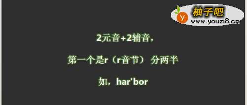 2音节划分要注音r音节。如果两个元音字母中间有两个辅音字母,第一个是r,这两个辅音字母,也分别划入左右两个音节。第一个音节(左边那个音节)称为r音节,按重读r音节读音规则发音,如har'bor
