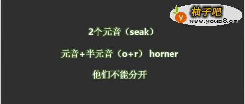 3如果两个元音或元音和半元音字母组合发的是一个元音或双元音,划分音节时,不能将其从中分开,要划在一起。如, seak, horner