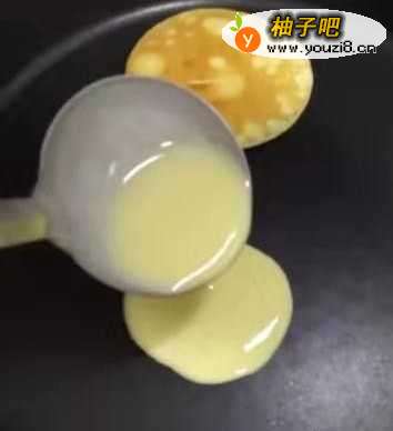 2锅烧热后,倒入一小勺,缓慢倒入自然滴成圆形,薄薄的很容易熟,上面凝固冒小泡再翻面。