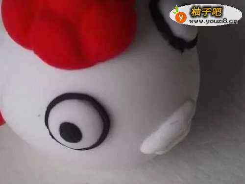 5用黑色和白色粘土拍圆至扁做出鱼的眼睛,安置脸部适宜的位置,并在其中下方勾出鱼的小嘴巴,如图即可。