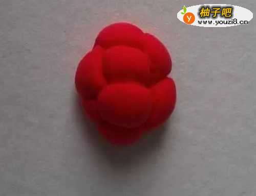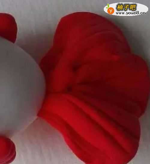 2取一块大小适宜的红色粘土,轻轻的搓圆,就像搓一小球一样,无需表面光滑,可借助工具慢慢将其表面弄成一块一块的凸状,用来放置金鱼的头顶部。