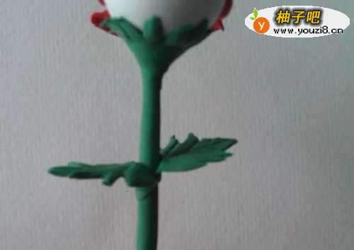 6取一块大小适宜的绿色粘土做出小枝目的是为了支撑小鱼,叶片部位捏成水滴状拍扁,弄出叶片文理即可,漂亮可爱的小鱼就完成了。