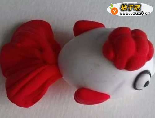 4取一块大小适宜的红色粘土,慢慢拍扁至扇状,较宽一边的边缘慢慢弄出波浪状,勾画出其纹路,轻轻整理,放置后面作鱼尾。