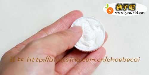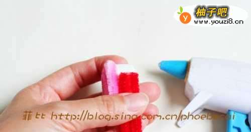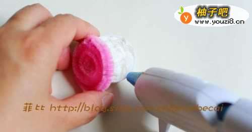 7将红色毛根对折,拼排用胶粘在瓶盖侧。