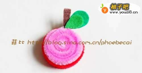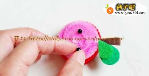 9在红色和粉色毛根交接处粘上苹果的梗与叶子。