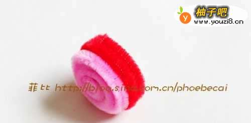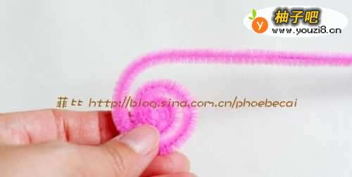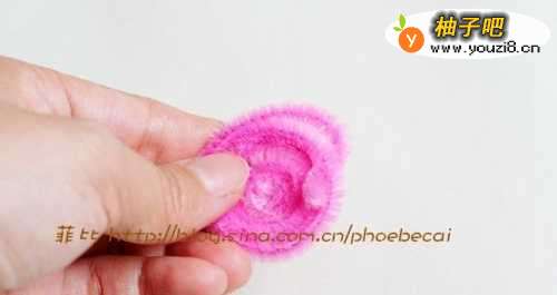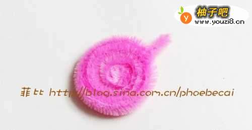 2取粉红色毛根如图卷成一个密实的圆形,末端留2公分不卷。