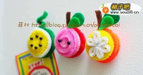 喝完的水瓶盖不要丢,我们用易折并能随意缠绕的毛根包装一下,就能将它变为居家实用小物。让孩子开发想像力,做成各种各样的水果造型冰箱贴,美化家居。