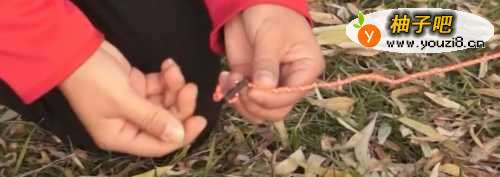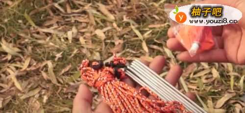 44.固定防风 在帐篷的边角按放防风钉,然后在帐篷上的束带上系上防风绳,注意要打两结,更为牢固,将防风绳的另一端系在防风钉上,这样帐篷就可以抵御一些寒风了。