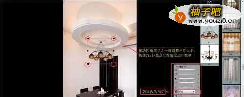 5双击空间中的吊灯机会出现矩形虚线框,拖动四角黑点可调整吊灯大小,点击黑色三角可改变吊灯方向,按住键盘Ctrl键+四角黑点可对吊灯角度进行微调,同时将吊灯素材的属性中效果改为“吊灯”,打开“视图”中的“渲染场景”,再右击空间中吊灯,选择“打开”;
