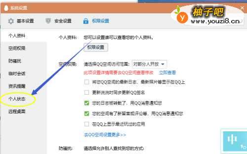 4到了权限设置界面下,也是有许多的功能,点击左侧分类标签栏中的【个人状态】。