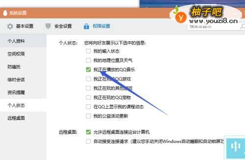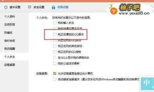 5此时,我正在播放的QQ音乐前是被勾选的,也就是说,他人能看到自己所在听的QQ音乐情况,点击取消勾选。