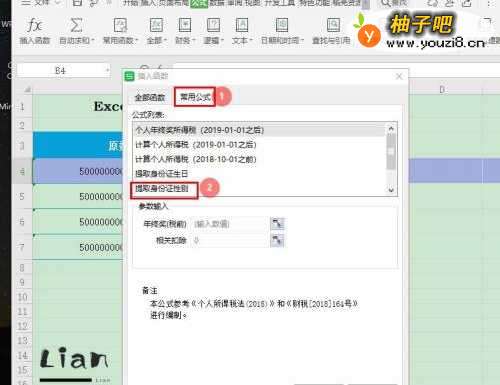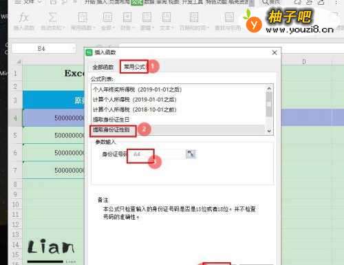 3在“插入函数”窗口,点击【常用公式】,选择【提取身份证性别】;