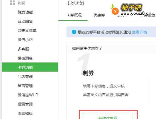 22、进入卡券功能-卡券概况之后,在制券里面点击新建优惠券,如下图。