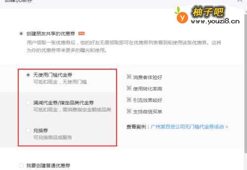 33、创建优惠券之后,选择创建朋友共享的优惠券,然后三种门槛可以根据自己需求选择,如下图。