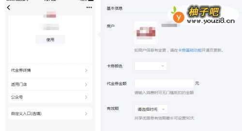 44、然后接着选择卡券的颜色,填写卡券的金额,有效期、可用时段等,这个与普通的卡券是一样的,没有太大的区别,如下图。
