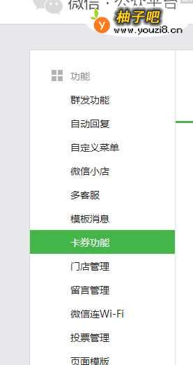 1、首先我们登入微信公众平台后台,在左侧导航栏里面的功能里面找到卡券功能,点击进入,如下图。