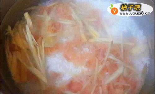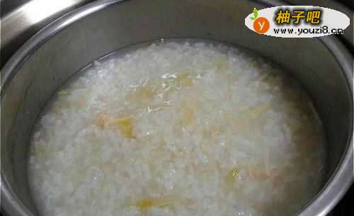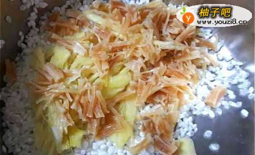 先把干贝泡软再撕开,米洗净,加入姜丝。