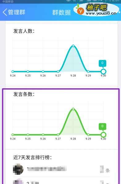 7弹出的界面,我们就可以看到发言条数和发言排行榜了,如图所示。这个群的聊天还是比较少的,排行榜就两个人还有发言也是很少的。