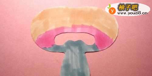 6最后,用橙色的马克笔,在剪出的好看的蘑菇的图形上,涂颜色,注意颜色要涂均匀,并用浅灰色的马克笔在好看的蘑菇的底部图形上,涂上颜色,这样一个好看的蘑菇剪纸手工就制作好了,如下图所示。