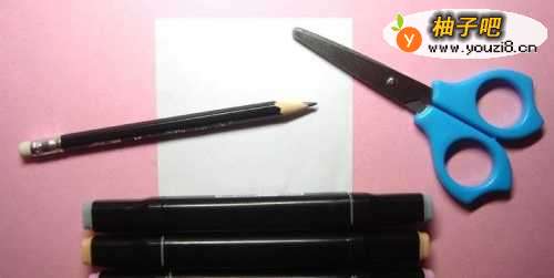 准备好,制作好看的蘑菇儿童剪纸手工的材料和工具,有白纸、正方形卡纸、马克笔、铅笔,剪刀,如下图所示。