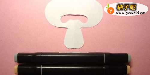 5然后,把好看的蘑菇图形的剪纸,展平,摆放在桌子上,并选择浅红色和灰色、棕色的马克笔,准备涂上颜色,如下图所示。