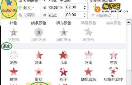 4再点击【添加动画】的下三角形→【退出】→【旋转】,如下图所示。
