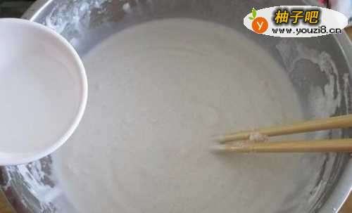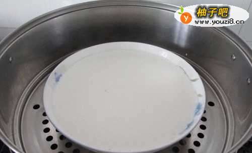 6取一个大一点的盘子,盘里均匀的抹上油后倒入粉糊冷水上锅大火蒸25至30分钟后取出待凉。