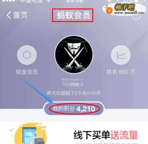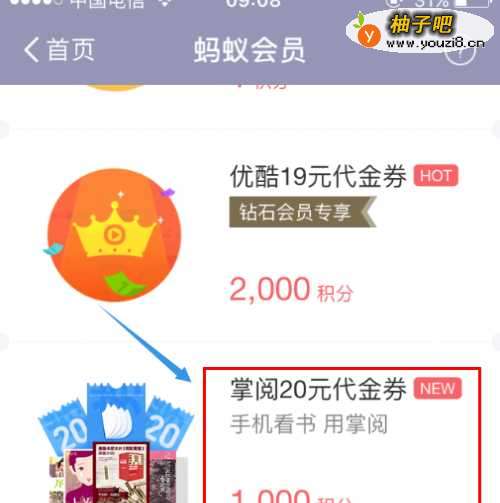 2在该页面可以看到目前我们的蚂蚁积分,接着往下拉动页面,可以看到活动里有"掌阅20元代金券"相关信息,见下图;