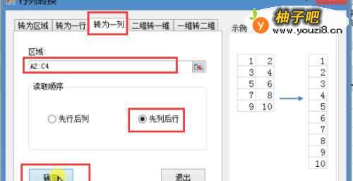 4【行列转换】对话框中,单击【转为一列】 区域选择A2:C4,【读取顺序】选择“先列称秤后行”(注:读取顺序按需求选择,还可以是先行后列) 单击【确定】