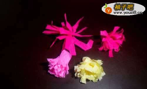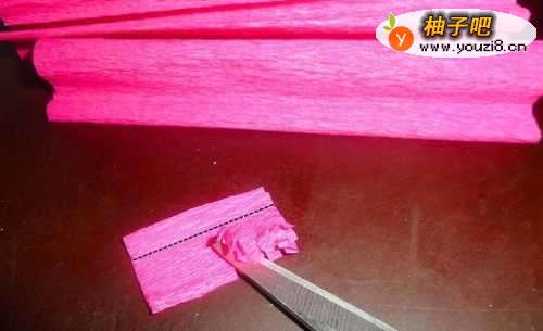 10为了点缀的话,我们可以辅以皱纹纸小花朵。其做法很简单。剪一段小长条,反复对折。