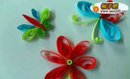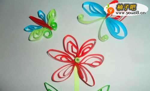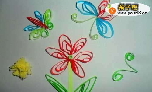 7用卷花瓣的方法卷出蝴蝶翅膀,再用笔芯卷出蝴蝶触须。