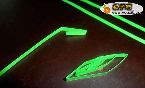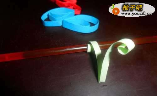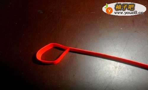 3按照图示用红色纸条圈折出花瓣形状。每圈与圈之间留出空隙,末端用胶水粘住。