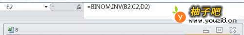 3在EXCEL中,打开【8.XLSX】后,选择【E2】单元格,在编辑栏中输入公式【=BINOM.INV(B2,C2,D2)】,如下图所示。