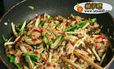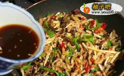 5最后加入笋丝、木耳丝翻炒后,加入青椒丝,再放点红油小火翻炒即可。