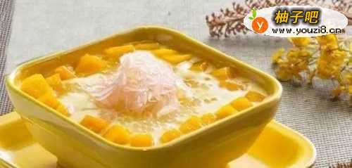 8、在容器最底层铺好西米,冰块芒果泥、芒果块,最后倒入放凉的椰浆就OK了。