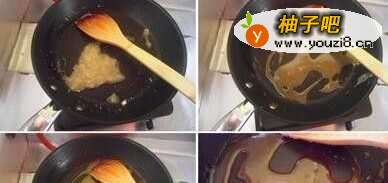 5炒到起泡加入盐(这样比较不会腻),糖会像图一样的变化,等到糖变红褐色就差不多了,要用勺子不断搅拌避免黏锅