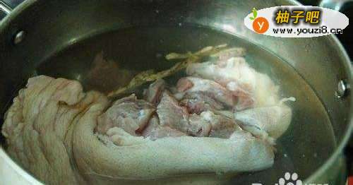 4猪蹄洗净之后整块放汤锅里,加冷水,几片姜,适量料酒,把水烧开,再小火煮几分钟,煮出血沫