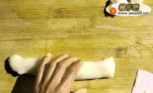 2先把案板上涂上一层水(这样就不会粘在案板上),再把蒸熟的糯米粉用刮板从盘里铲出来,手上沾上温水把面团揉成团,放在手上搓成长条,用面板刀切成一个个小的面剂子。