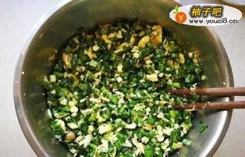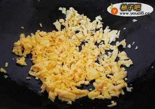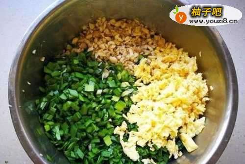 3将炒好的鸡蛋仔锅中捣碎,连同切碎的韭菜和蟹味菇一同倒入料理盆中。