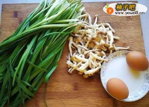 备料,韭菜洗净切碎,蟹味菇洗净切末。