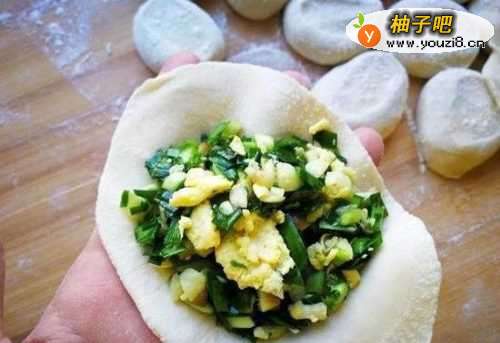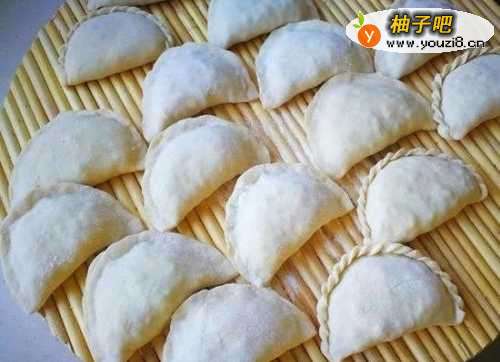 5饺子皮中放入馅料包成饺子状(饺子皮可以做,也可以买现成的擀薄片后,在其中一片放上馅料,然后用另一片盖上并将边缘按压粘合)。