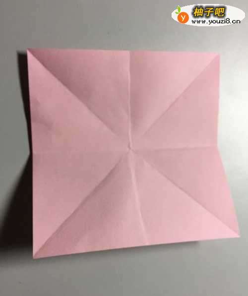 将正方形彩纸两对边对角分别对折,折出折痕。