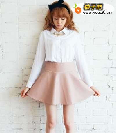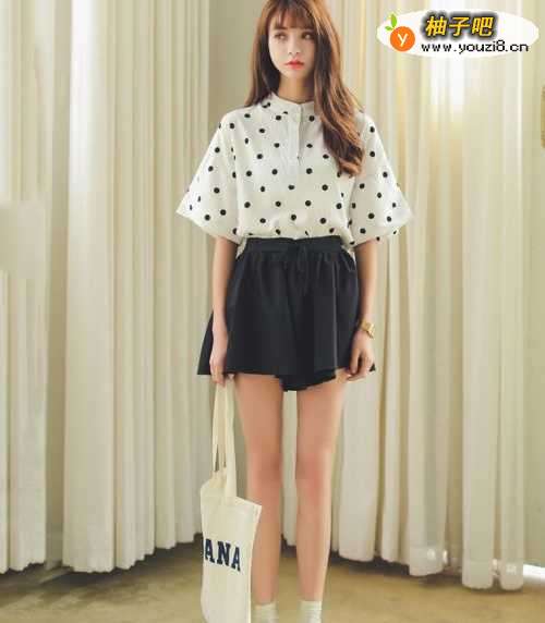4白色宽松无领黑点衬衫搭配高腰裤裙,白与黑的完美结合,腰线提高,身材比例加长。既可爱又不失隆重,适合年龄跨度可以很大。适用人群比较广泛。