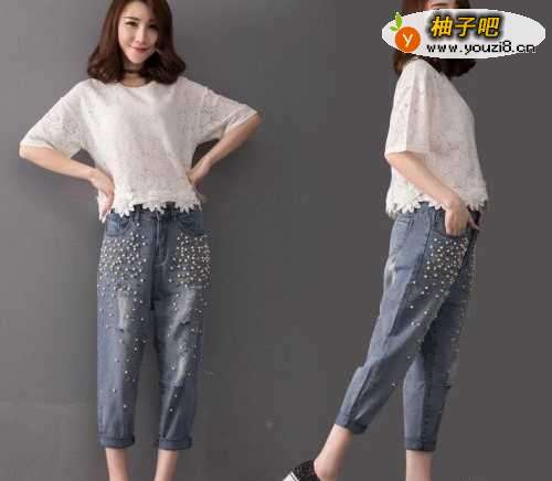 3白色绣花短T恤,搭配高腰宽松牛仔裤,既美观又实用,任何场合都非常适用。有点中性风的感觉,跑步啊有运动什么的都可以试一下。
