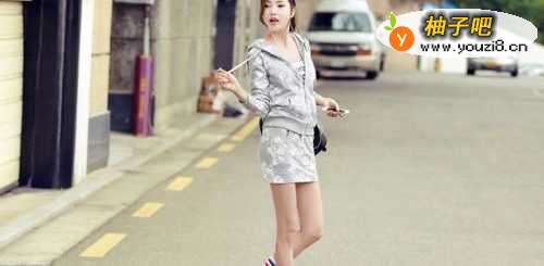 这一件是运动系列的套装,上身搭配开衫短外套,下身高腰短裙,非常显瘦显高。适合一早一晚出去跑步,或者偏好运动风的矮个女孩。