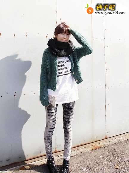 5绿色短款针织毛衣,中长款卫衣再搭配紧身破洞牛仔裤,延长腰部与腿部的长度,这一个搭配非常可以成为春秋两季矮个女生的模板。