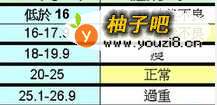2中国人由于人种的不同,一般认为体重指数正常的应该在19到22.9之间。如果体重指数在23到25之间就算超重,25到30之间算轻度肥胖,30到35是中度肥胖,超过35是重度肥胖。
