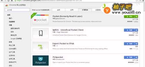3我们知道在Pocket里面进行添加网页是很麻烦了,所以Pocket推出了浏览器扩展,我们可以在Chrome应用商店里面搜索下载,如图所示