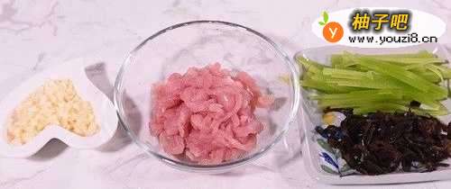 1.将青笋、木耳切丝备,里脊肉、大蒜切末装盘备用