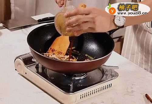 44.锅中倒入适量的食用油,待油热后,加入豆瓣酱、蒜末炒出香味